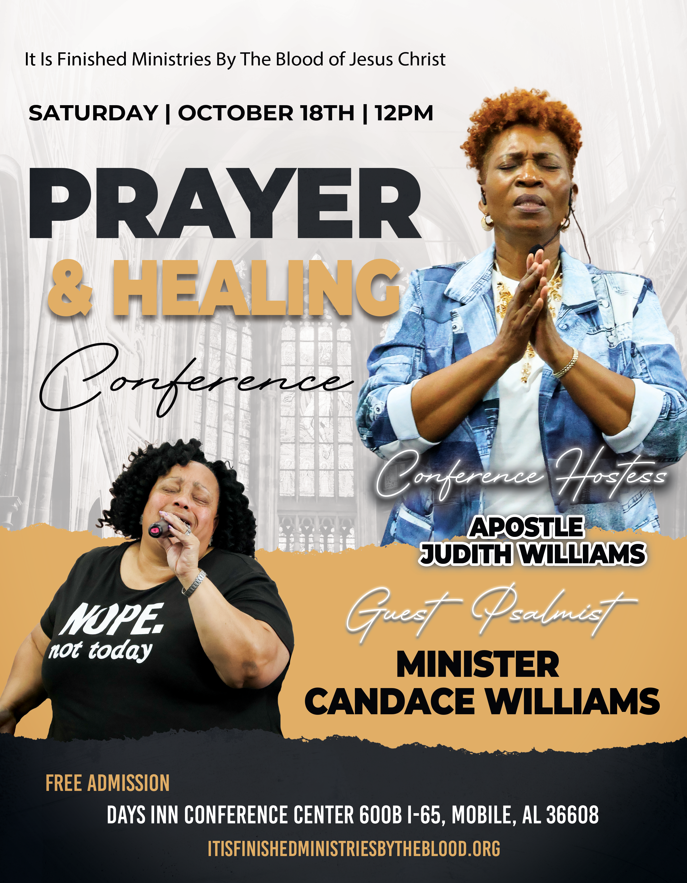 You are warmly invited to the Annual Prayer and Healing Conference 2025, hosted by It Is Finished Ministries by the Blood of Jesus Christ, on Saturday, October 18th at 12:00 p.m. at the Days Inn Conference Center. This powerful gathering will be led by Conference Hostess, Apostle Judith Williams, with anointed worship from Guest Psalmist, Min. Candace Williams. Come expecting a mighty move of God as we seek His presence for prayer, healing, and restoration. Admission is free and open to the public—bring your family, friends, and loved ones, and experience the Spirit of the Lord like never before!
